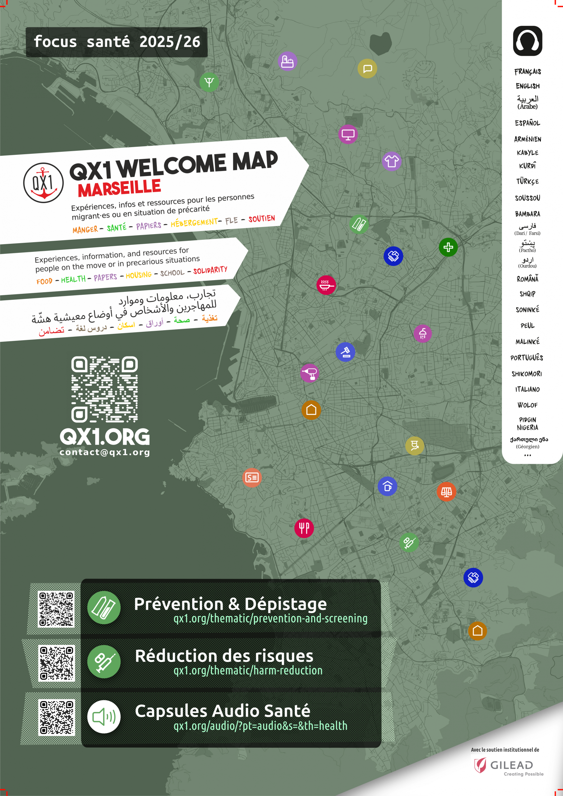 Poster QX1 Welcome Map - Focus Santé et P&DAffiche multilingue ( Fr/ En / Arabe) présentant le Focus Santé et P&D 2025, avec QR-codes donnant accès aux différents contenus produits dans ces domaines. Format A3 (297 x 420cm)